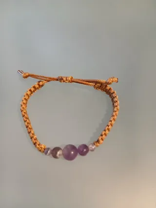 Pulsera hecha a mano con piedras naturales de amatista o su variante citrino, algunas combinadas con cuarzo. El diseño es ajustable. - Cierre de macramé. - Piedras de amatista. - Piedras de cuarzo. - Piedras citrinio - Entrega en simpática bolsita como para regalar. - El precio es unitario. - Tambien pulseras personalizadas.