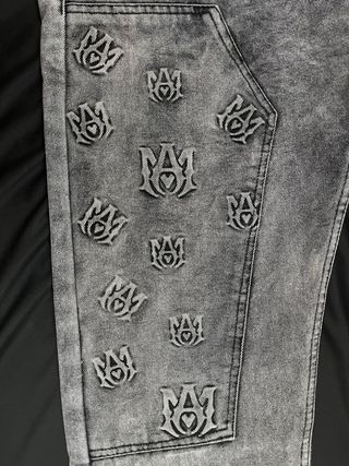 Pantalones vaqueros de Amiri con un distintivo acabado gris y un patrón de logos. - Diseño con lavado a la piedra. - Detalle de múltiples logos 'AMIRI' en relieve. - Bolsillo de parche en la parte delantera.
