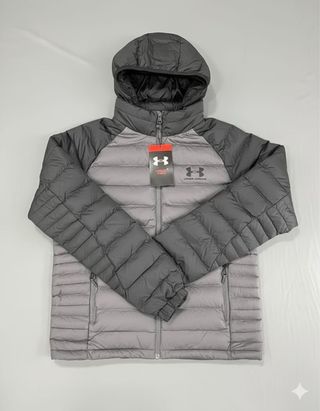 Chaqueta acolchada con capucha de la marca Under Armour. Combina paneles en gris y negro para un diseño moderno. - Diseño acolchado. - Capucha integrada. - Cierre de cremallera frontal.