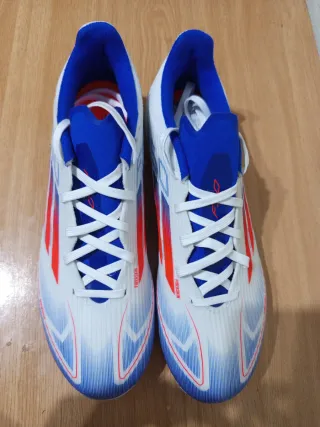 Botas de fútbol Adidas F50 en llamativos tonos azules y blancos. Diseñadas para ofrecer un rendimiento óptimo en el campo. A estrenar. Precio algo negociable. - Parte superior con diseño F50. - Detalle de franjas rojas. - Cordones blancos.