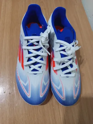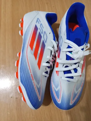 Botas de fútbol Adidas F50. A estrenar. Precio algo negociable. - Diseño con detalles en azul y naranja. - Cierre con cordones blancos. - Suela con tacos para césped.