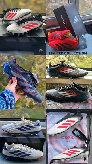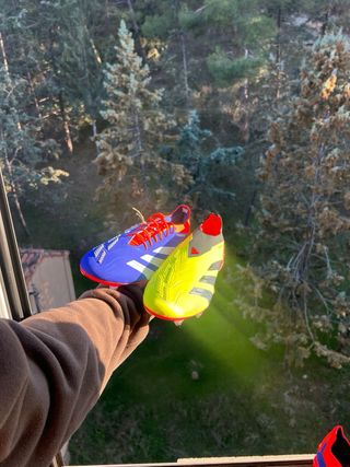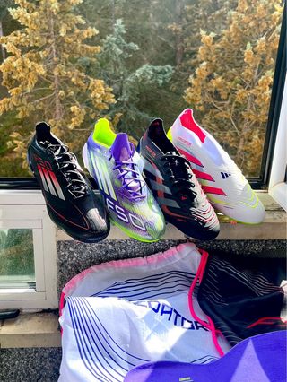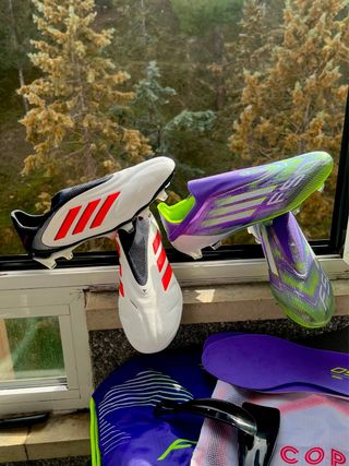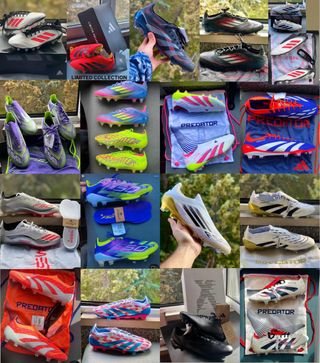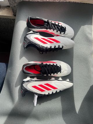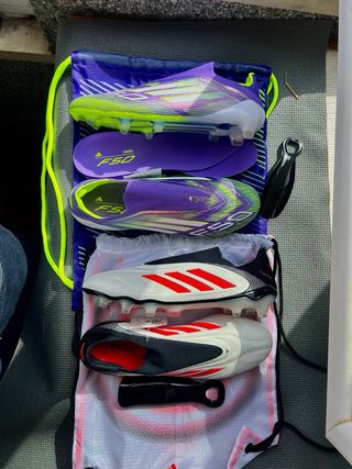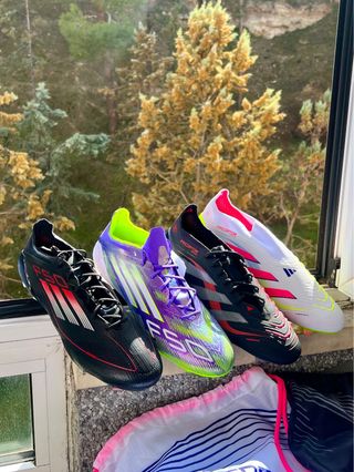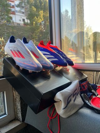 Pack de botas de fútbol Adidas de gama alta. - Modelo F50 negro con detalles rojos. - Modelo Predator negro con detalles rojos y grises. - Modelo Predator blanco sin coordones con detalles rosas y amarillos. - Modelo F50 morado con detalles verdes y amarillos. Gama alta elite .1 + AG FG SG Crzay fast