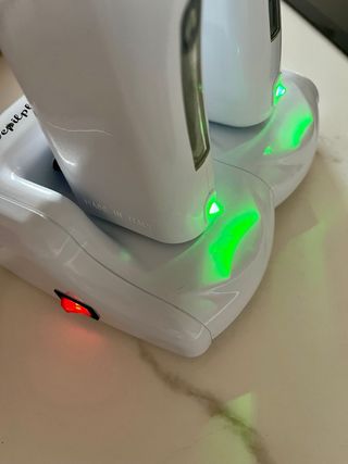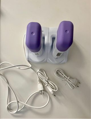 Base para depiladora eléctrica tipo roll-on. Incluye dos unidades y sus respectivos cables de carga. - Diseño moderno en blanco y morado. - Base de carga para dos depiladoras. - Dos cables de alimentación incluidos. Incluye 100 bandas para retirar