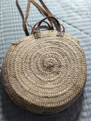 Bolso grande de mimbre con un diseño circular y asas de cuero. - Decorado con flores en tonos rosa y gris. - Material: Mimbre y cuero.