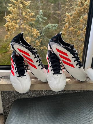 Pack de 2 botas de fútbol Adidas Copa Pure III Elite. - Talla 40.5. - Diseño en blanco con detalles en rojo y negro. -Gama alta, elite, .1, + SG FG AG F50, Predator, Copa mundial, PureIII