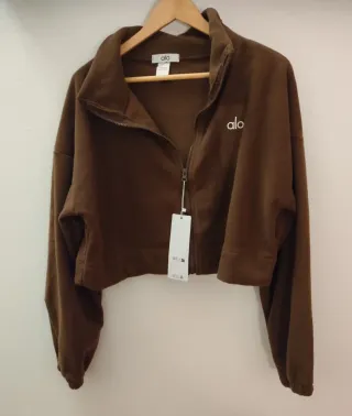 Sudadera Alo de color marrón, con cremallera frontal y cuello alto. - Diseño cropped. - Logo de Alo bordado en el pecho. - Puños y bajo elásticos.