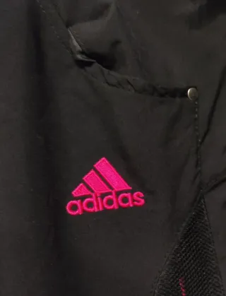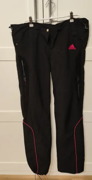 Pantalón deportivo Adidas en color negro, talla XL. Ideal para actividades deportivas. De cintura 46/48 - Diseño con detalles en color rosa. - Cremalleras en los bolsillos laterales. - Cordón ajustable en la cintura y en los bajos.