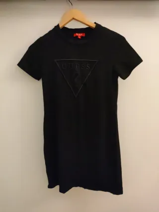Vestido negro de la marca Guess. - Diseño con logo de Guess en relieve. - Cuello redondo y manga corta.