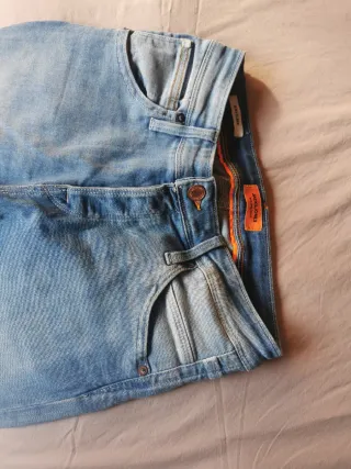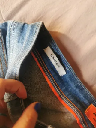 Tejano de la marca Jack & Jones, modelo Slim Fit. Talla 29 americana largo 34 - Corte ajustado. - Lavado desgastado. - Detalle de etiqueta naranja en el lateral.