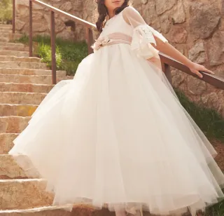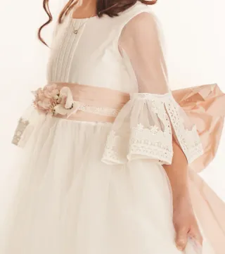 Hermosos vestido de comunión de diseño exclusivo. Talla 8 - 9 años - Mangas abullonadas de tul con encaje. - Cinturón de tela rosa palo. - Cuerpo con detalles de puntilla. - Falda de tul. Regalo can can. No Incluye cinto de flores.