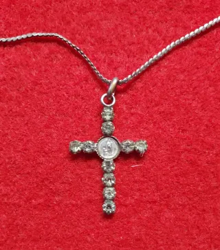 Cadena vintage con colgante de cruz adornado con cristales brillantes muy bien engarzados, y en el centro la virgen de Lourdes. La cadena parece plata però no lleva marca aunque el iman no se pega. - Diseño de cruz con detalles de cristales. - Estilo vintage.
