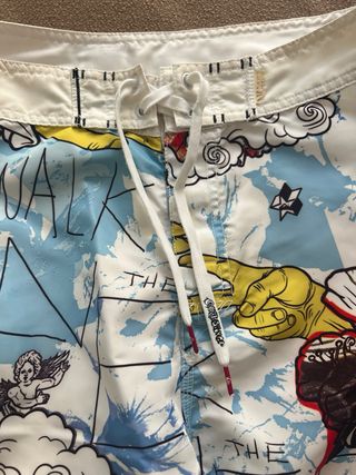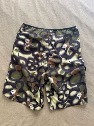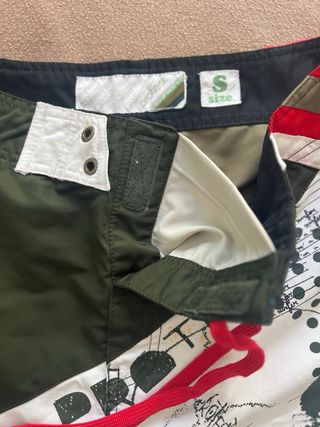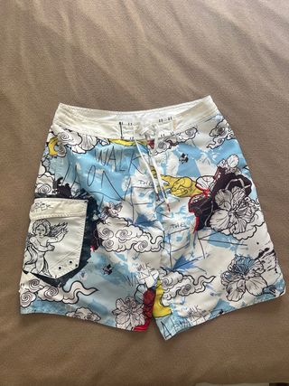 Bañador con un diseño divertido y original. - Estampado con nubes, flores y figuras. - Cordón ajustable en la cintura. - Bolsillo lateral derecha con velcro, muy práctico. - Talla 31 (M/L) se puede ver en la foto. Si dudas de la talla, contacta conmigo para vernos y probártelo sin ningún compromiso. Puedes ver otros bañadores similares en mi perfil.