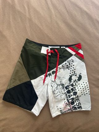 Bañador Quiksilver con estampado - Estampado con motivo tipo pinturas de colores militares (marrón, negro, verde militar). - Cintura elástica con cordón para ajuste en cintura. - Talla 31 (M/L) se puede ver en la foto - Bolsillo lateral izquierda con velcro, muy práctico. Si dudas de la talla, contacta conmigo para vernos y probártelo sin ningún compromiso. Puedes ver otros bañadores similares en mi perfil.
