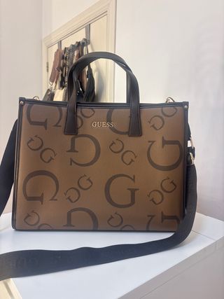 Bolso de mano y bandolera de la marca Guess con un diseño moderno y elegante. - Color marrón con estampado integral de la G de Guess. - Asas superiores de cuero. - Correa bandolera ajustable y extraíble. - Cierre superior.
