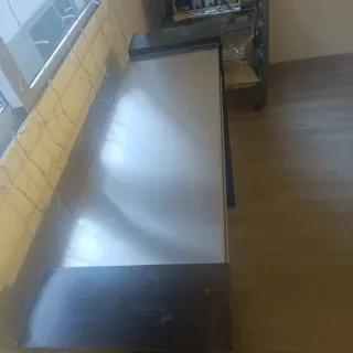Tocador de peluquería con un diseño moderno y funcional. - Superficie principal en acabado plateado. - Base inferior en tono madera oscura.