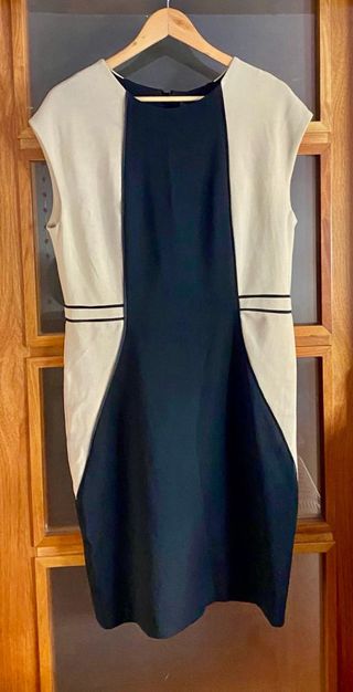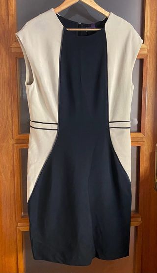 Elegante vestido de Mango Violeta con un diseño bicolor. - Combinación de paneles en beige y negro. - Detalles de ribetes finos en contraste. - Corte que estiliza la figura. -efecto faja reductora , con forro. -con elasteno