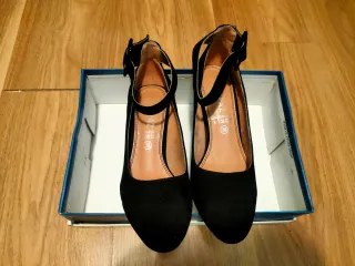 Elegantes zapatos de tacón negros con detalle de pulsera al tobillo. Material: Ante. Tacón grueso. Cierre de hebilla. Creo que se usaron para una boda y no se han vuelto a tocar.
