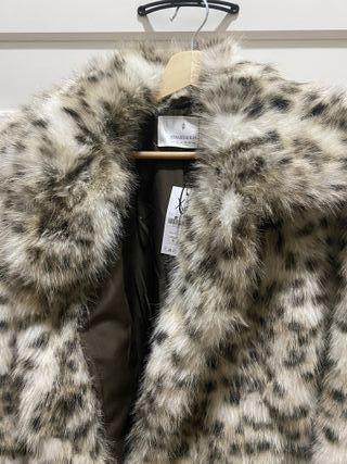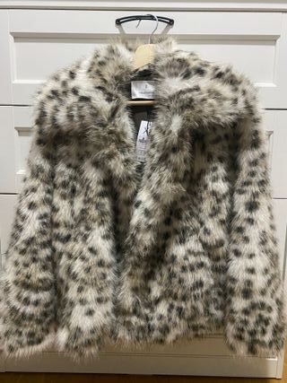 Abrigo de pelo sintético con estampado animal. - Diseño de pelo sintético suave. - Estampado de manchas en tonos beige y gris. - Cuello amplio.