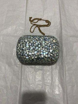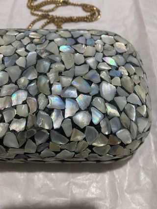 Elegante bolso de mano para eventos especiales, con un diseño único. - Cubierto de pequeñas piezas iridiscentes. - Incluye una cadena dorada para llevarlo al hombro.