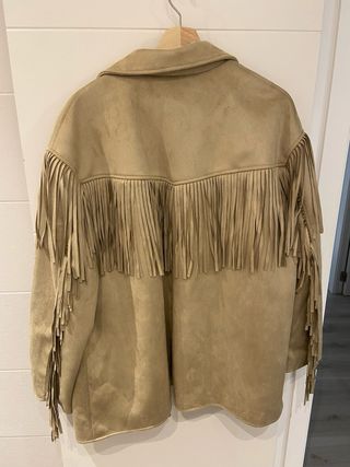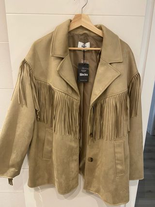 Cazadora de la colección de Rita Ora para Primark con un diseño de flecos. Nueva con etiqueta - Talla holgada - Color beige. - Detalle de flecos en mangas y parte delantera. - Cierre de botón.