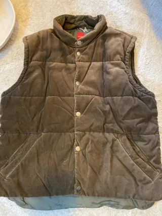 Chaleco de pana en color verde caqui, con un estilo retro de los años 90. - Cierre de botones. - Bolsillos frontales. - Diseño de corte recto. - Forro interior negro.