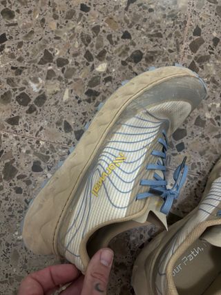 Zapatillas Hoka con un diseño moderno y llamativo. - Parte superior de tela con líneas curvas en azul. - Cordones de color azul. - Suela de goma resistente. están un poco sucias de los 50km que tienen
