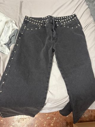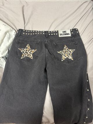 Pantalones vaqueros negros de la marca One Dilema, con un diseño único. Con etiqueta, sin utilizar - Decorados con tachuelas plateadas en cintura y laterales. - Corte ancho en las perneras. - Lavado desgastado.