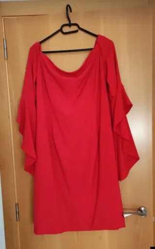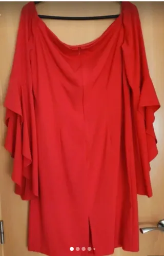 Vestido rojo con diseño de hombros descubiertos y mangas acampanadas. - Diseño de hombros descubiertos. - Mangas acampanadas. - Largo hasta la rodilla. Usado 1 solo día para un evento