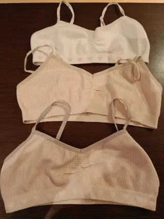 Pack de tres sujetadores para niña, cómodos y con un diseño juvenil. - Uno de color blanco. - Dos de color beige. - Detalle de corazones en la banda inferior.