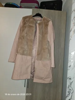 Abrigo elegante con un diseño moderno y cálido. - Combina tejido rosa con un panel frontal de pelo sintético. - Cuello redondo. - Cierre frontal.