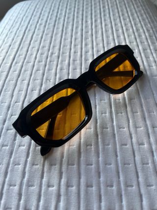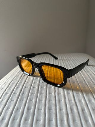 Gafas de sol estilo vintage con montura negra y lentes naranjas. - Diseño rectangular. - Montura de acetato. - Lentes tintadas.