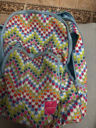 Mochila y bolsa de regalo con un alegre estampado de corazones. - Diseño vibrante y colorido. - Cierre de cremallera. - Incluye una bolsa a juego.