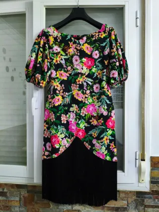 Vestido con estampado floral vibrante y detalle de flecos en el bajo. - Pecho: 41 cm - Cintura: 37 cm - Cadera: 50 cm - Largo: 110 cm - Tejido elástico