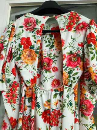 Vestido elegante con estampado floral, ideal para bodas y eventos especiales. Su tejido elástico ofrece comodidad. - Espalda descubierta. - Diseño con flores rojas y blancas.