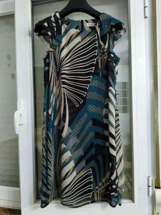 Vestido de fiesta, invitada de boda. Usado en una ocasión, como nuevo. Talla XS. Estampado en tonos caldera, morado y azul. Escote cuadrado-recto y mangas 3/4 abullonadas. Corte largo/midi y ajustado. Favorece mucho y es cómodo