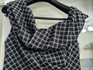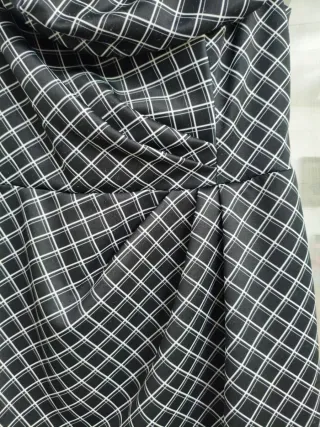 Vestido con un diseño de cuadros en blanco y negro. La tela es de neopreno elástico. - Un tirante recto y el otro caído.