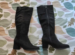 Botas altas de ante con tacón. Un básico elegante y cómodo para tu armario. - Material: Ante - Color: Negro - Tipo de tacón: Bloque - Cierre: Cremallera lateral