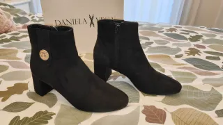 Elegantes botines de ante negro con tacón. Cuentan con un detalle de botón metálico en el lateral. - Cierre de cremallera. - Tacón grueso.