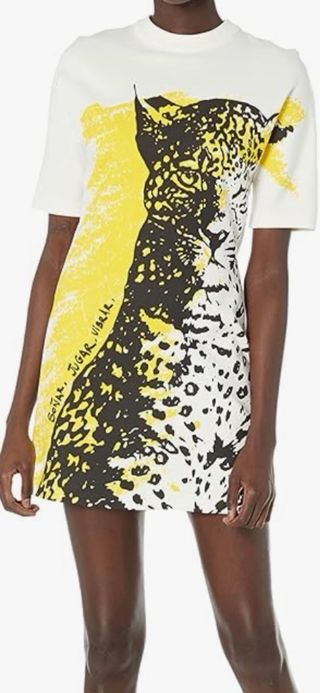 Vestido de manga corta con un llamativo estampado de leopardo en blanco, negro y amarillo. El diseño presenta un cuello alto y una cremallera en la espalda. - Estampado de leopardo. - Cuello alto. - Cremallera trasera. -VENTA EN PERSONA