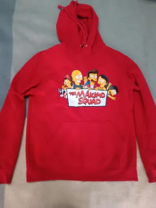 Sudadera roja con capucha y bolsillo frontal, diseño “The Máximo Squad” en la parte delantera. Talla S (ver etiqueta en fotos). Ha tenido uso, con ligeros signos normales de uso en el tejido, propios del lavado y el roce, sin manchas, rotos ni desperfectos. En buen estado general, cómoda y con mucha vida útil. Ideal para uso diario.