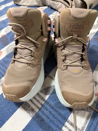 Zapatillas Hoka Anacapa con tecnología Gore-Tex. - Color beige y marrón. - Diseño de caña alta.