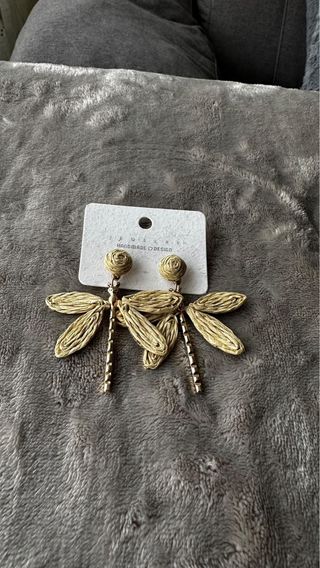 Pendientes con un diseño único en forma de libélula. - Elaborados con materiales de calidad. - Acabado en tonos beige y dorado.