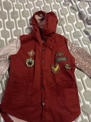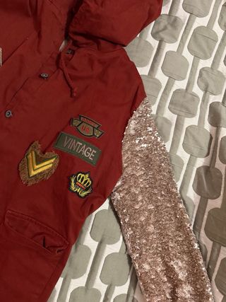 Chaqueta de estilo vintage con detalles llamativos. - Mangas con lentejuelas doradas. - Parches decorativos en la parte delantera. - Capucha con forro interior. - Bolsillos frontales.