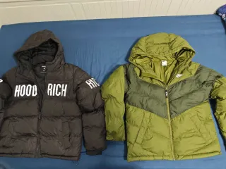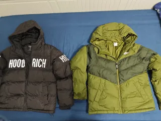 Se venden dos chaquetas de niño, una de la marca Nike y otra de Hoodrich. Son prendas abrigadas y con estilo. - Chaqueta Nike en color verde oliva y verde oscuro. - Chaqueta Hoodrich en color negro con letras blancas.