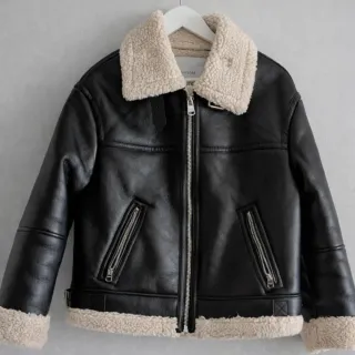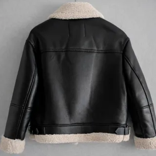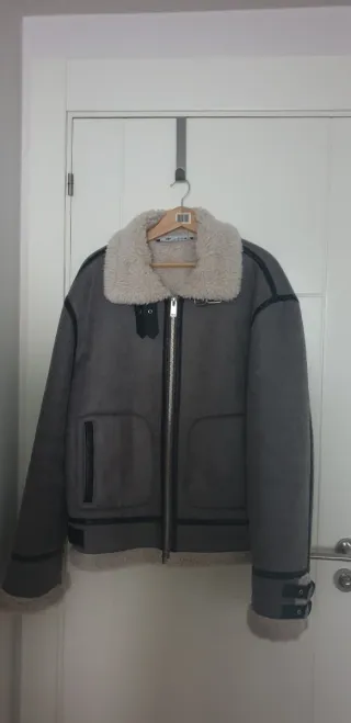 Cazadora estilo aviador de Zara con forro interior de borreguito. - Cierre de cremallera. - Bolsillos con cremallera. - Cinturón con hebilla en la parte inferior. - Cuello y puños forrados.