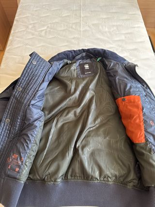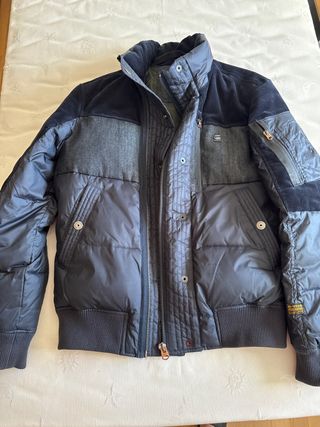Cazadora de la marca G-Star en talla S. Presenta un diseño moderno con diferentes texturas y paneles. - Paneles de pana en hombros y cuello. - Cuerpo acolchado. - Bolsillos con cremallera. - Puños y cintura elásticos.