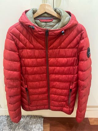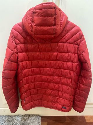 Cazadora acolchada de Zara con un diseño moderno y llamativo. -Casi nueva muy poco uso - Combinación de colores rojo y negro. - Capucha integrada. - Cierre de cremallera. - Puños elásticos. - Cordones ajustables en el bajo.