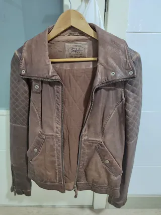 Elegante cazadora de piel de la marca Cortefiel. - Diseño clásico con cuello mao. - Cierre de cremallera. - Dos bolsillos de solapa en el pecho. - Cinturón ajustable a la cintura. - Detalles acolchados en hombros y cintura.