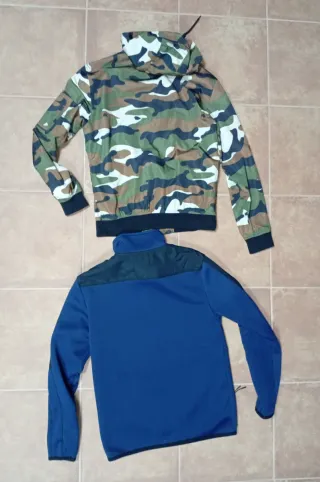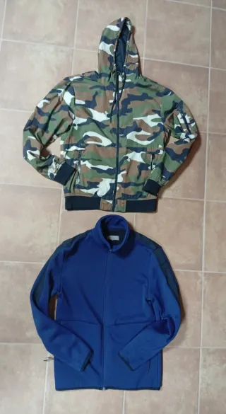 Conjunto de dos cazadoras térmicas. - Una cazadora con estampado de camuflaje y capucha. - Otra cazadora de color azul marino con cremallera.