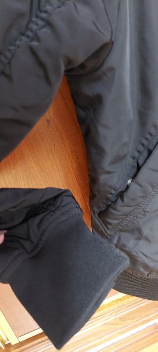 Cazadora de estilo bomber en color negro. - Da poca talla XL, XXL más o menos. - Cuello alto. - Cierre de botones y cremallera - Bolsillos frontales e interiores. - Puños y bajo elásticos. - puños algo rozados, ver fotos.